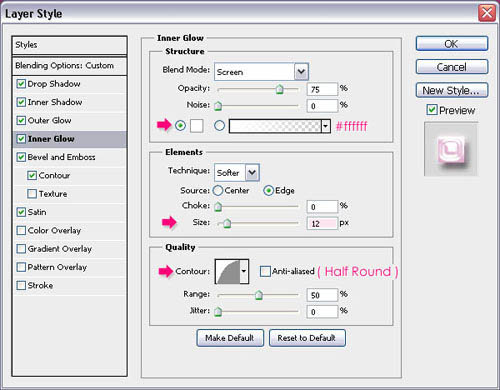 8、内发光:颜色更改为#000000 ,以及大小12 像素,等高线到半圆。