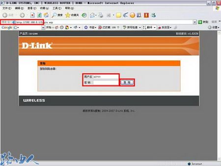 一、连接到DI-524M无线路由器之后,打开WEB浏览器,在地址栏键入192.168.0.1,点击回车,弹出如下界面,填入用户名和密码。