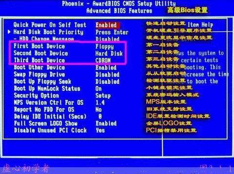 在启动计算机时立即按 Delete (Del)【删除键】进入 BIOS【基本输入输出系统】设置 2 选择 Advanced BIOS Features 【高级 BIOS 特性设置】,并将 First Boot Device (1st Boot) 【第一启动设备】根据需要设置为 CDROM 【光盘启动】。 具体操作:将光标移动到 First Boot Device (1st Boot),按 Enter 选择CDROM.在按ESC.再按F10保存退出.如果保存不了CDROM 【光盘启动】。那要检查主板有没有电池了