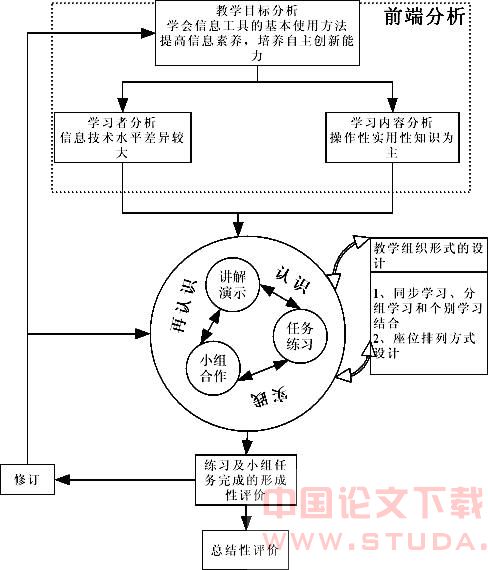 在中学信息技术的教学中,我们尝试性地提出一种教学过程的设计模式(如图4所示),它对教学组织形式的设计是和教学具体环节紧密相结合的,而教学中的讲解(同步学习)、任务或练习(小组学习或个别化学习)和小组合作是相互穿插的。结束部分的教学评价也是设计过程的重要环节,它是修改的基础,是教学设计成果趋向完善的调控环节。对教学中的每个环节的教学效果要进行形成性评价,及对学生的平时上机练习和小组任务完成情况都要密切关注,并对教学中的各环节进行修订,在教学进程或教学方法上加以改善。