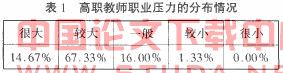 1.高职教师职业压力水平的总体评估。从高职教师的职业压力分布来看,67.33t%的高职教师感到“压力较大”,l4.67%的高职教师感到“压力很大”,可见,我国高职教师的职业压力问题相当突出(见表1)。