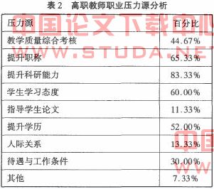 1.影响高职教师职业压力的来源分析。从表2可看出,影响高职教师职业压力的主要来源有:提升科研能力(83.33%),提升职称(65.33oa,)和学生学习态度(60.00%)。这三方面的压力可以进上步概括为,来自学校考核及工作本身的压力。可见,学校的考核机制是对高职教师职业压力产生了最大的影响。