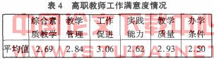 2.高职教师的工作满意度分析。从表4可以看出,高职教师对“工作促进”的满意度最高,而对“办学条件”的满意度最低。可见,高职院校目前的办学条件相对落后是让高职教师感觉最不满意的方面。