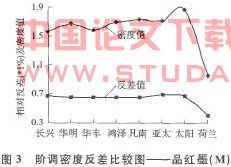 另一种评价印刷品阶调再现的方法是评价印刷品的阶调密度反差。当具有较高的印刷相对反差值时,其实地密度又较高,印刷品的阶调再现性较好。同样,以品红墨各纸样的阶调密度反差(如图3所示)为例,