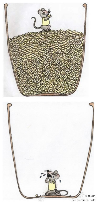 一只老鼠掉进了一个半满米缸,这意外使老鼠喜出望外,确定没有危险后,它一顿猛吃,吃完便睡。